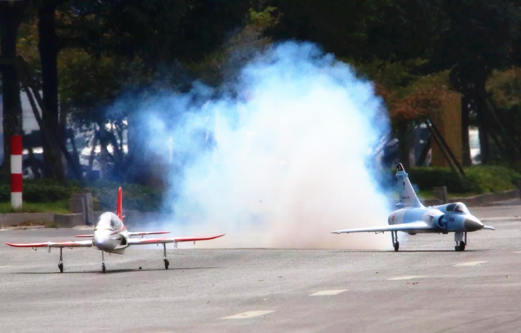 迪奥普科技的涡喷航模--幻影2000和超级毒蛇组队的花式表演,穿云破雾,冲上云霄,红绿拉烟在空中飞舞,场面壮观,给今天的表演画上了圆满的句号。